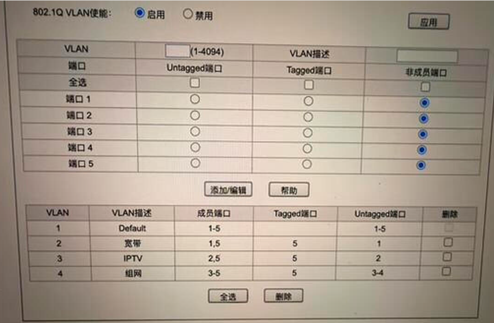 步骤一:设置弱电箱交换机,先把弱电箱交换机通电,网线连接电脑,进入交换机后台。进入 802.1Q VLAN 功能页面,按照图片设置,1 号端口插光猫到交换机的网线,2 号端口插光猫 IPTV 接口到交换机的网线,3 号端口接到卧室的网线,4 号端口接到书房的网线。5 号端口接到客厅的网线。